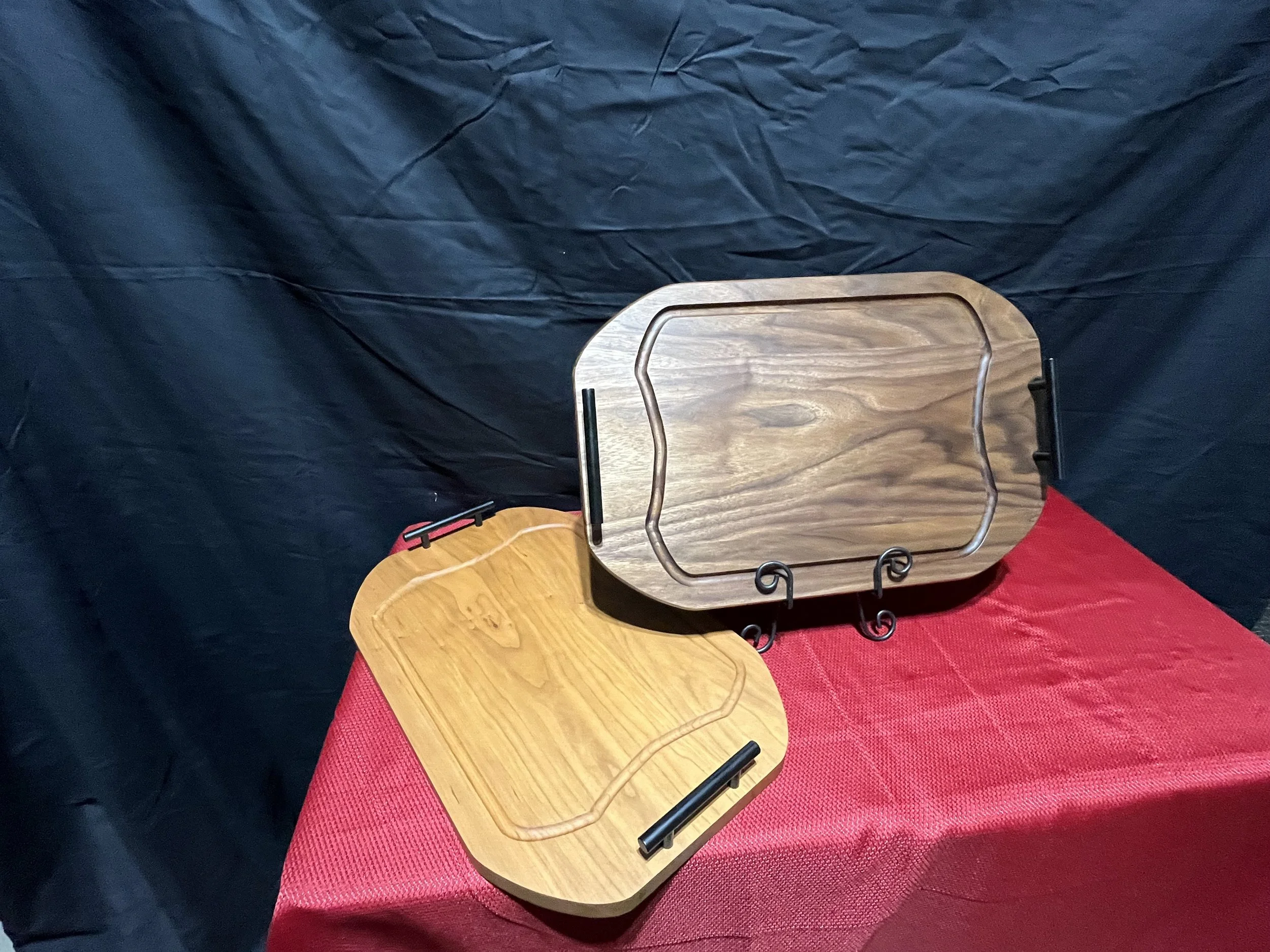 16x18x1 Reversable Cutting Boards, smooth on one side, juice groove on the other, lip on each end to lock into counter top for nonslip, comes in Walnut, Cherry, and Maple $100