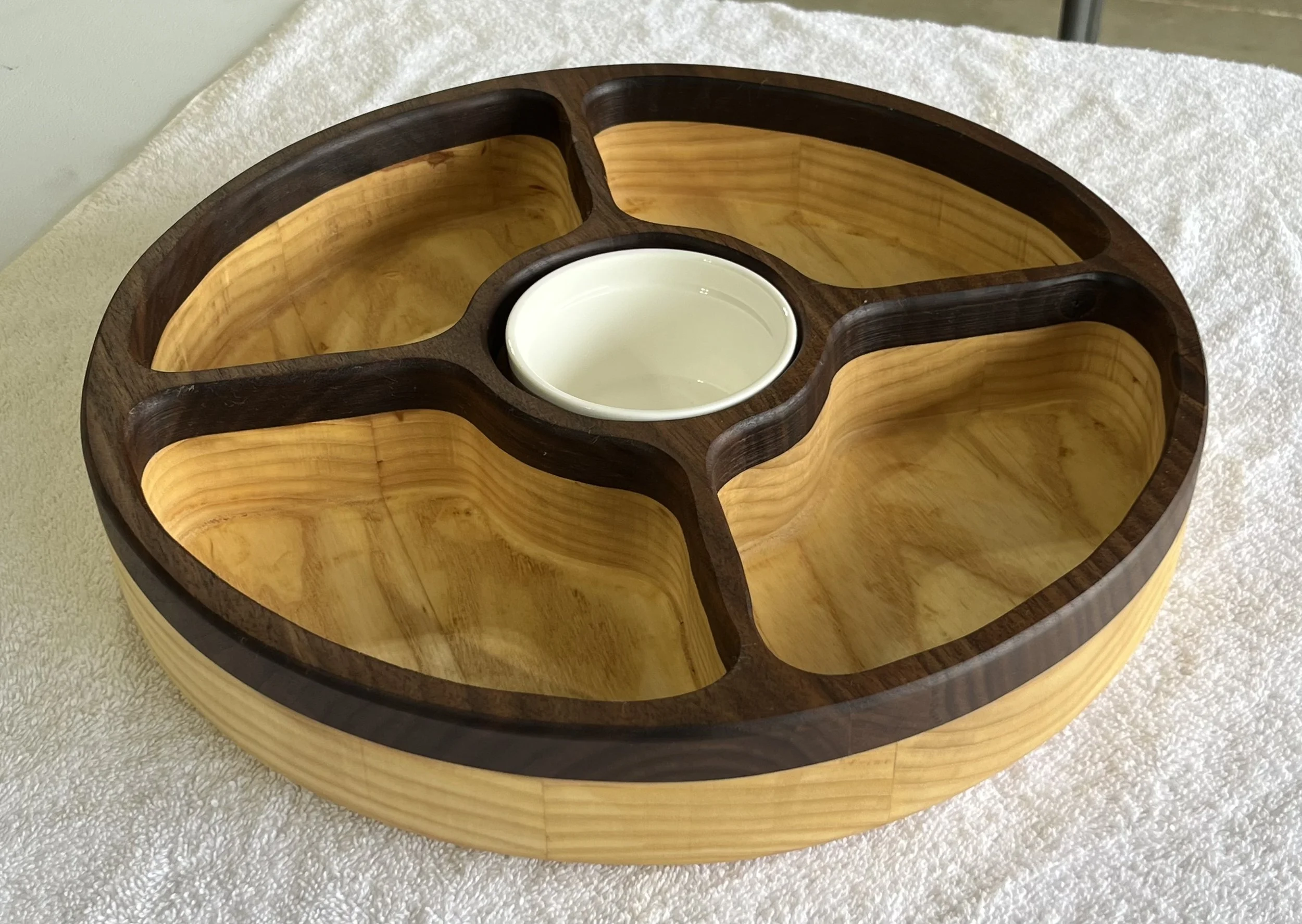 14” Ash and Walnut serving bowl, customer can choose from several species of wood, comes with dip bowl, $60
